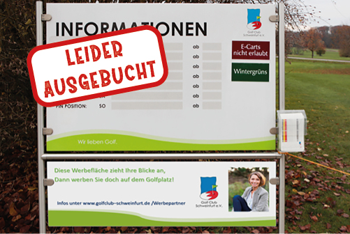 Wer vor dem Spiel die aktuell besonderen Regeln und Platzinfos erfahren möchte, schaut auf diese Tafel. In der Regel tun dies alle Golfer. Dabei fällt die Werbung (exklusive Platzierung, nur ein Werbeschild) direkt ins Auge.
